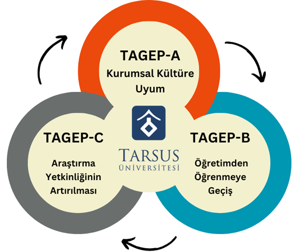Tarsus Üniversitesi Akademik Gelişim Programı (TAGEP) kurum kültürünü yaygınlaştırmayı, yükseköğretimde “öğretimden”, “öğrenmeye” dönüşüm sürecinde akademisyenlerin “kolaylaştırıcı” ve “öğrenme süreçlerinin yöneticisi” rolüne adapte olmalarını sağlamayı bunun yanı sıra bilimsel araştırma ve yayın süreçlerindeki yetkinliklerini artırmayı amaçlamaktadır. TAGEP programı, Tarsus Üniversitesi’nin tüm akademik birimlerinde kurumsal gelişimi ve öğrenme süreçlerinin yanı sıra Ar-Ge ve Yenilik süreçlerinde akademik personelinin bilgi, beceri ve yetkinliklerinin artırılmasını amaçlayan TAGEP-A, TAGEP-B ve TAGEP-C programlarını içermektedir.